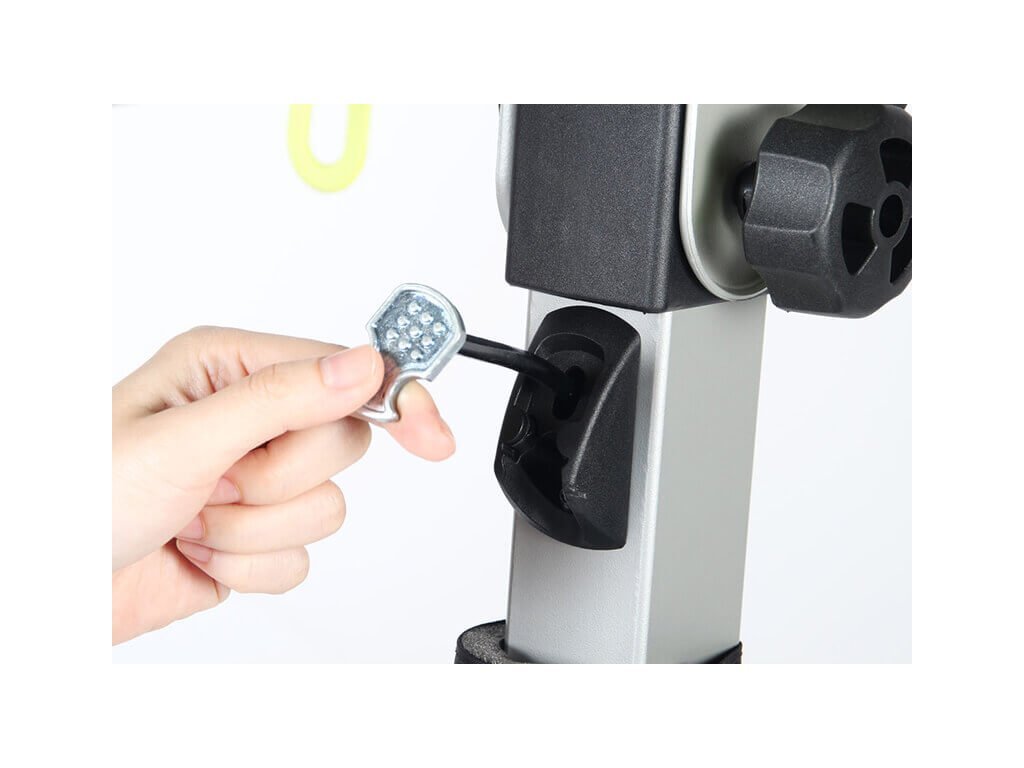 Nosič kol Buzz Buffalo 4 je možné uchytit na jakékoli tažné zařízení bez použití nářadí. To zajišťuje otočné dotahovací zařízení, které stačí pouze položit na tažnou kouli a dotáhnout otočnou hlavicí. V hlavici se nachází zámek, kterým celý nosič uzamknete. V případě, že se jedná o opotřebovanější kouli na tažném zařízení, uchycení nosiče můžete zajistit dotažením pojistné matice (klíč je součástí dodávky).