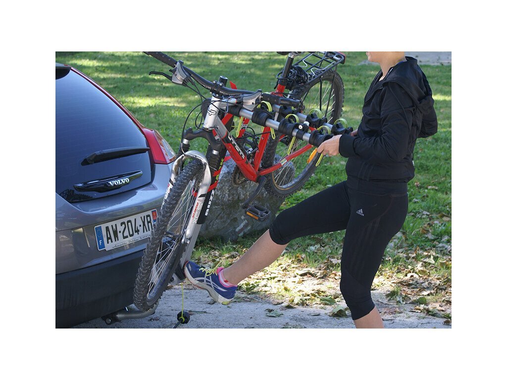 Závěsný cyklonosič na tažné zařízení určený k převozu čtyř kol. Odklápěcí, uzamykatelný. Minimální rozměry umožňují pohodlné skladování.
