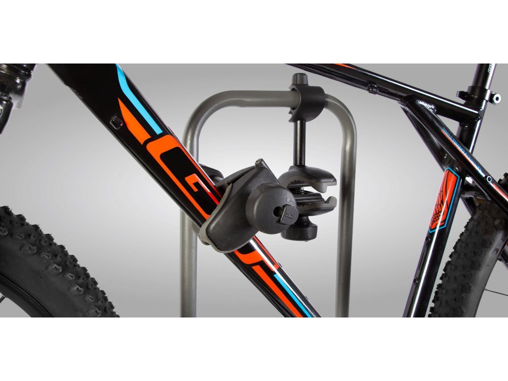 Držáky rámů jízdních kol připevněné na pevném madle se po něm mohou posouvat, a tak se přizpůsobí jakémukoliv tvaru rámu jízdního kola.