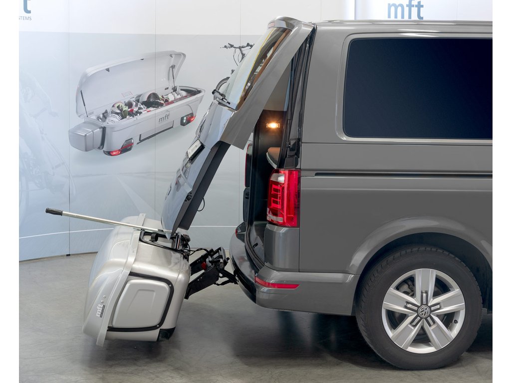 Podpora náklonu s odnímatelnou opěrnou tyčí. Zařízení MFT BackSupport se skládá ze dvou částí - optimalizované rukojeti a podpěrné tyče. Rozšiřuje sklápěcí mechanismus zadního boxu na tažné zařízení MFT BackBox, protože při sklápění nahoru a dolů lze dosáhnout většího pákového efektu. Za tímto účelem je třeba nejprve vyměnit černou přídržnou lištu na zadní straně zadního krytu.