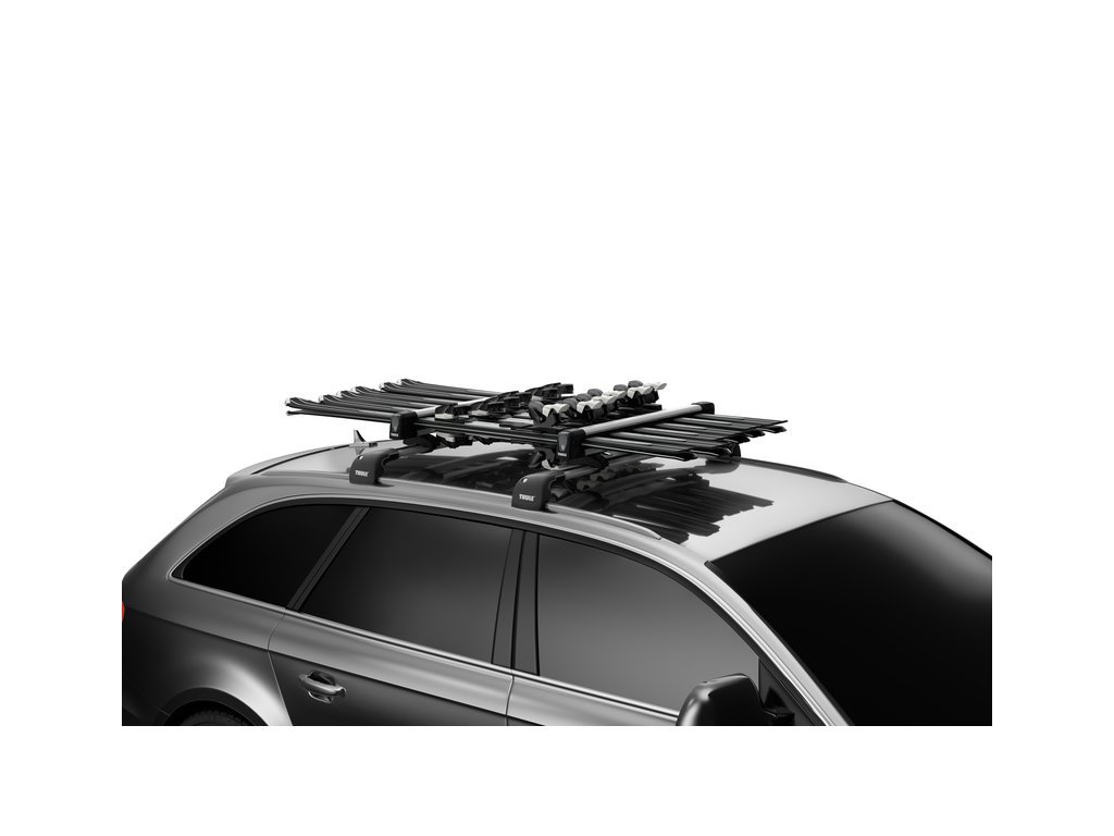 Thule SnowPack 7326 je střešní nosič, na kterém přepravíte 6 párů lyží, nebo 4 snowboardy. Šířka přepravní plochy je 75 cm, to je dostačující i na přepravu 6 párů carvingových lyží.