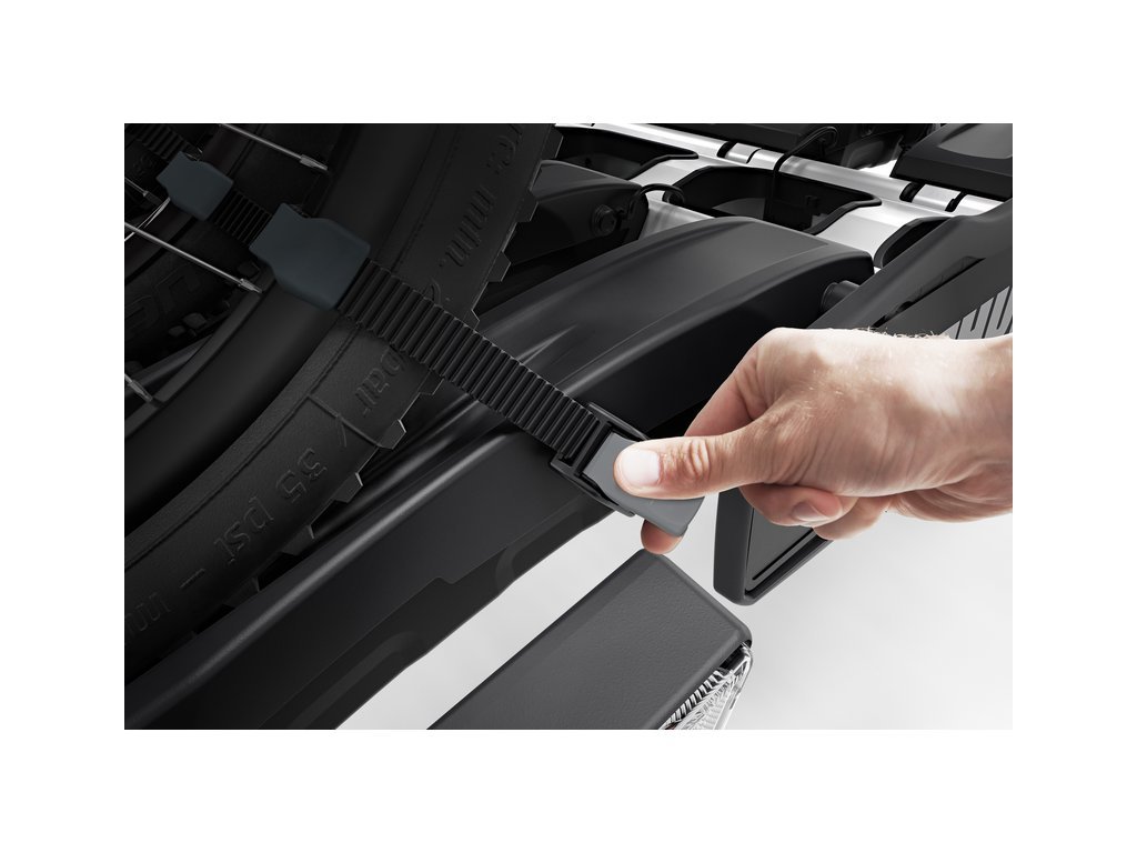 - Nastavitelné pracky s extra dlouhými popruhy umožňují pohodlné upevnění jízdních kol i s extra širokými pneumatikami (až 4.7 palcovými).