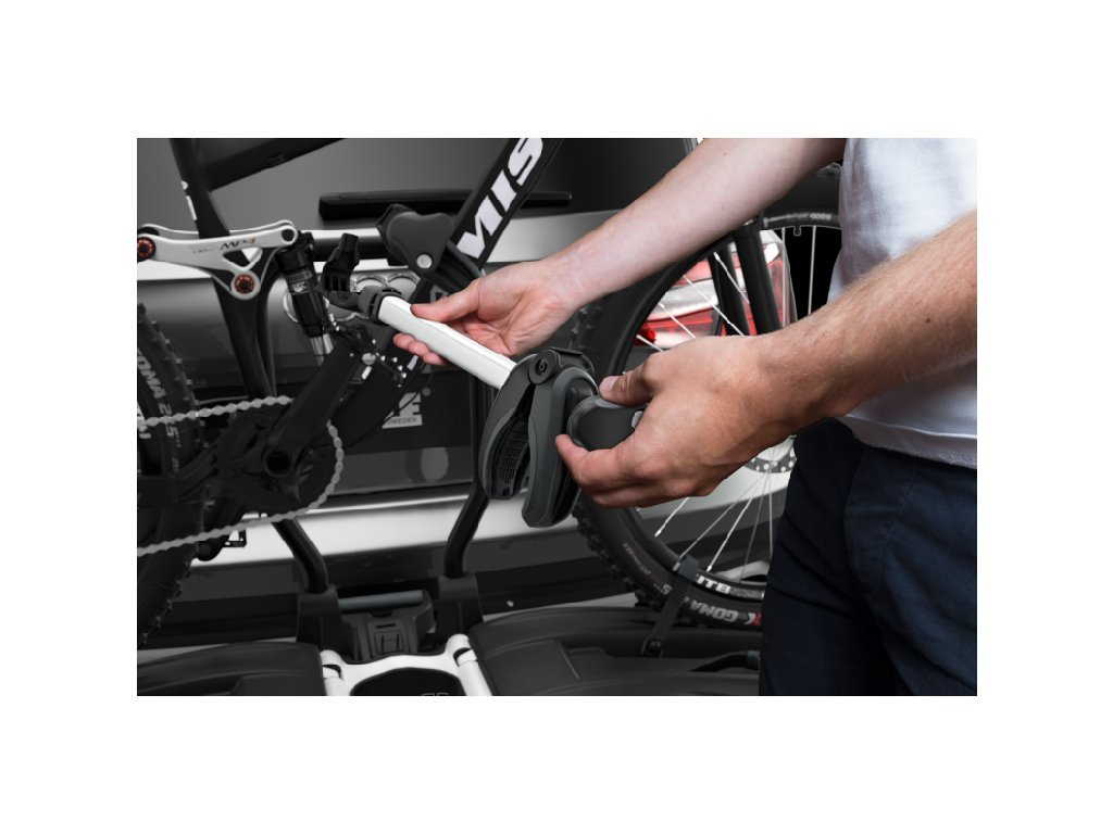 Kola k nosiči upevníte jednoduše díky odnímatelným držákům rámu vybaveným uzamykatelnými růžicemi s omezovačem momentu utažení Thule AcuTight, který cvakne v momentě kdy je kolo optimálně dotaženo. Držáky jsou dostatečně velké pro montáž kulatých i oválných rámů ( 22 - 80 mm) a jsou vybaveny gumovým povrchem pro ochranu rámu jízdních kol.