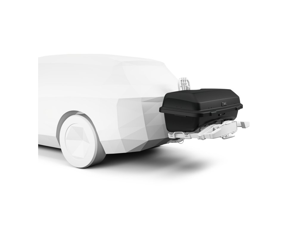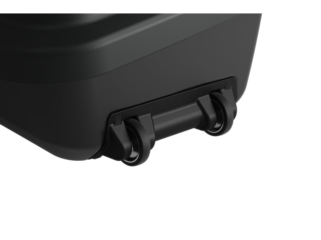 Box Thule Santu je umístěn nízko nad zemí, což zaručuje snadné nakládání a vykládání bez námahy. Dvě robustní kolečka a ergonomická rukojeť umožňují jeho hladké přesouvání na místo a pomocí sklápěcího mechanismu nosiče kol získáte snadný přístup do kufru vozidla.