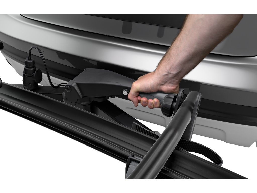 Výklopný mechanismus nosiče THULE VeloSpace se ovládá pomocí inteligentního nožního pedálu, což Vám ponechá volné ruce k přidržení jízdních kol během vyklápění. Dostanete se tak bezproblémově k zavazadlovému prostoru i s koly namontovanými na nosiči.