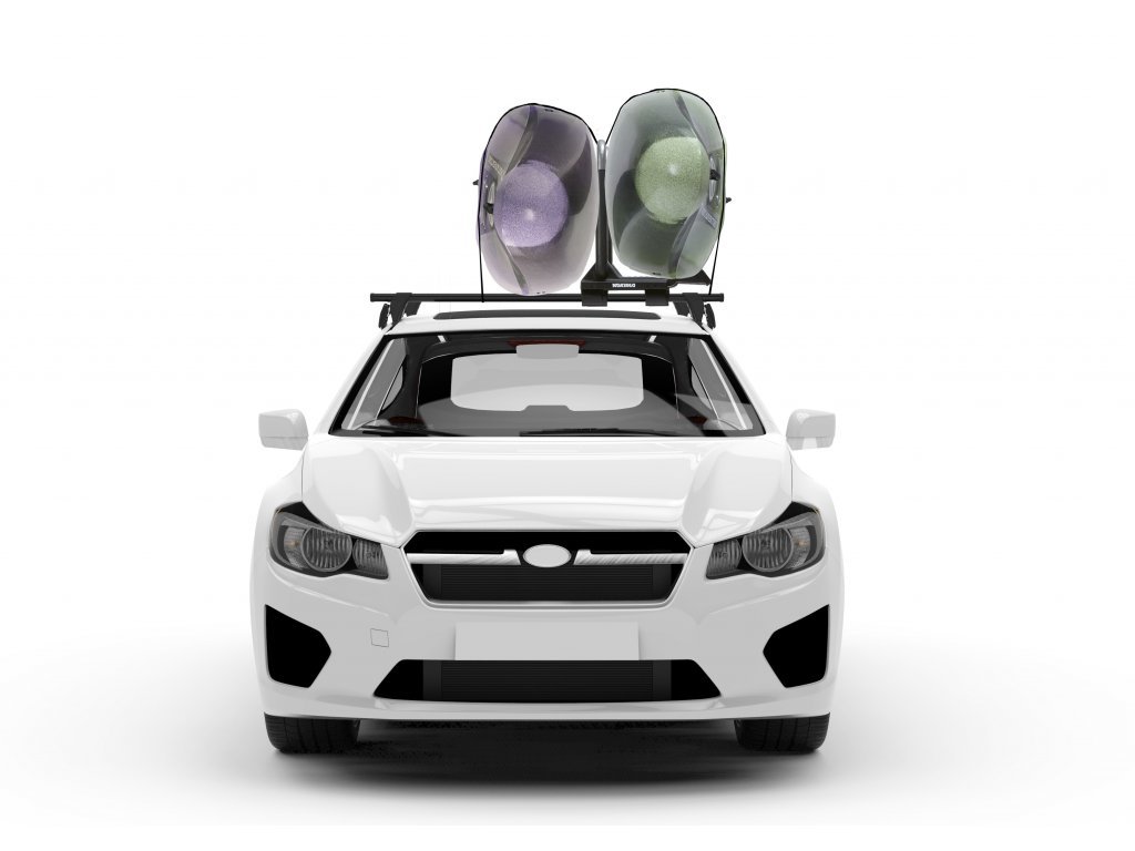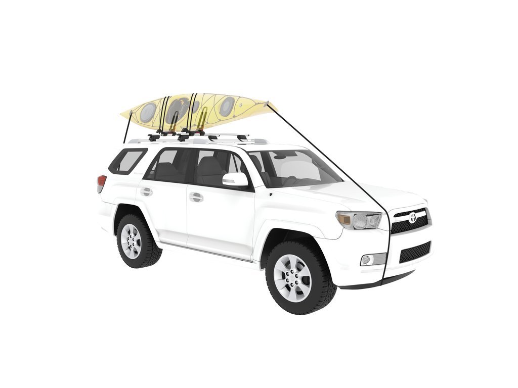 Střešní nosič určený k převozu jednoho nebo dvou kajaků. Popruhy pro upevnění kajaku jsou součástí balení.