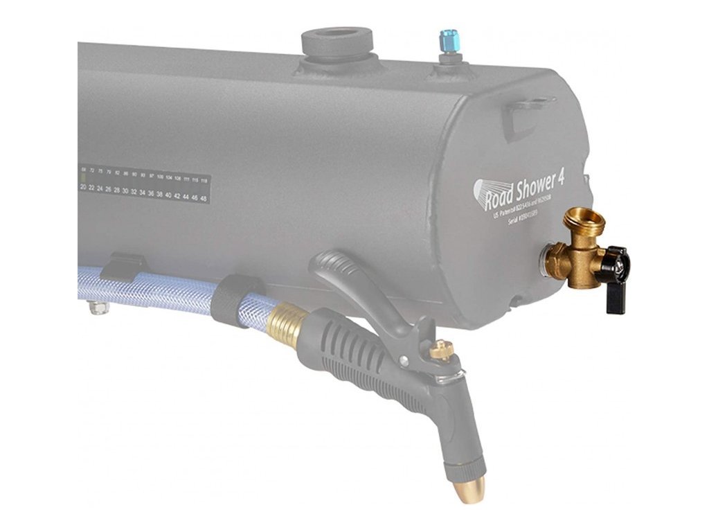 Přídavné koleno k cestovní sprše Yakima RoadShower s uzavíracím ventilem, kterým lze regulovat výstupní tlak vody pro různé použití.