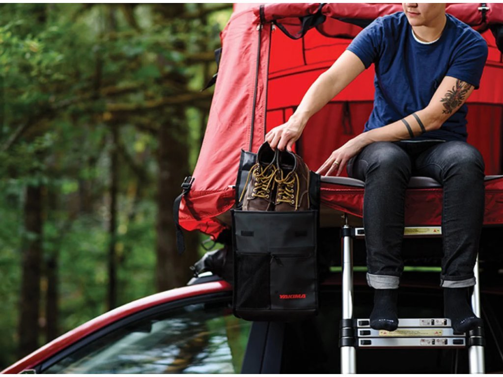 Taška se jednoduše připevní závěsným systémem do kolejničky – SideTrack na vnější straně stanu a díky tomu se budete vyzouvat a obouvat komfortně, přímo u vchodu do stanu.