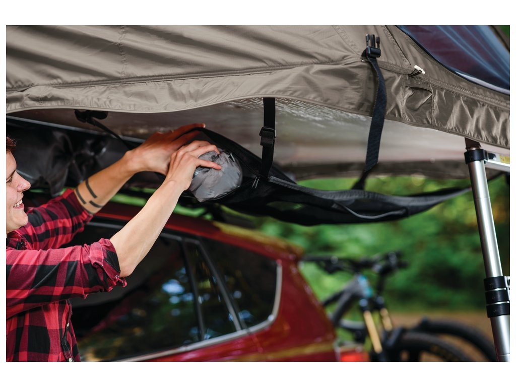 Na upevnění do interiéru použijete poutka, která se provléknou přes konstrukci stanu a k uchycení do exteriéru použijete úchyty určené na zasunutí do SideTrack™.